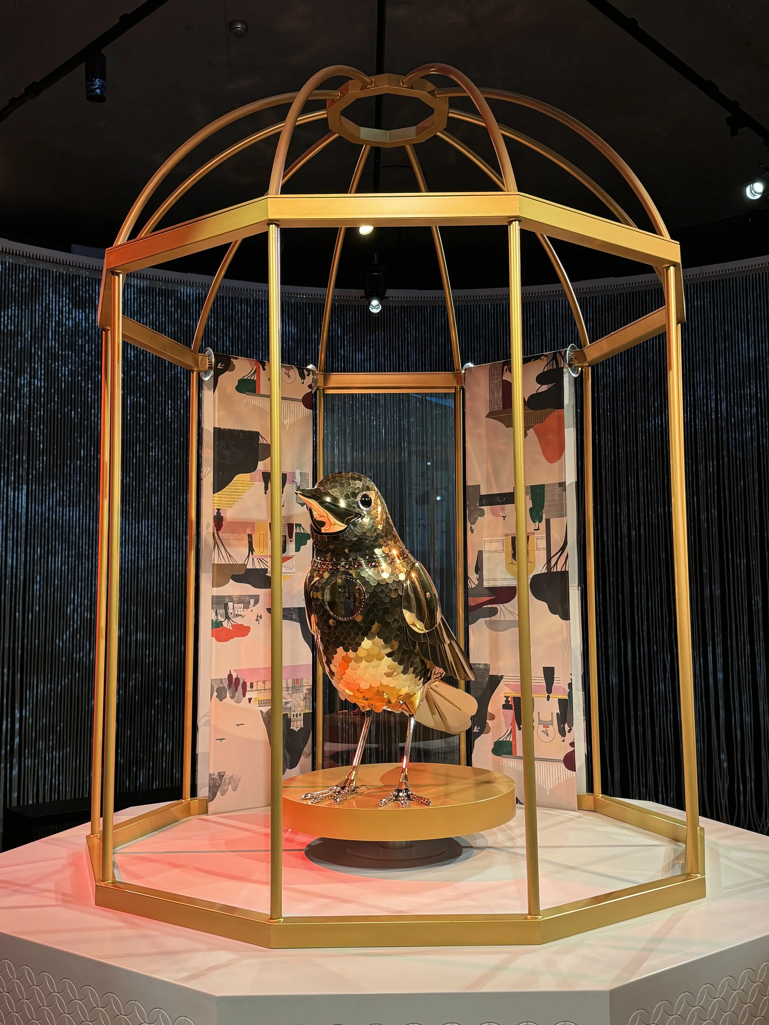 My favorite section was a large gallery space displaying Andersen’s stories as art, in particular The Nightingale. Set in the middle of a circular room stood a large golden cage and inside a gilded mechanical bird, glittering with multicolored gems. I turned the large metal knob on the side, winding up the contraption and making the bird sing. I also enjoyed the areas dedicated to The Snow Queen and The Ugly Duckling, as both showcased paper cutting, an artistic talent of Andersen’s.